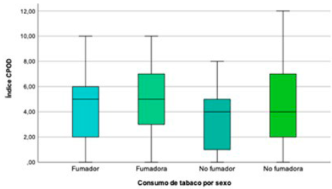 Los individuos fumadores presentan un índice CPOD mayor que los no fumadores aproximadamente con 1 punto de diferencia; fluctuando el índice de moderado a alto. No obstante, las pruebas estadísticas no permitieron evidenciar la correlación entre fumar y un aumento del índice CPOD, a diferencia de otros estudios que sí fueron estadísticamente significativos. A su vez, se puede concluir que pese a no establecer una relación causal entre el hábito de fumar y la aparición de caries dental, el fumar tabaco debe ser considerado un factor de riesgo de enfermedades dentales.