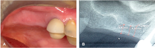 En la valoración intraoral se observa ausencia clínica y radiográfica de los dientes 15 y 16, disminución de altura ósea del reborde alveolar en la zona de premolares, presenta un tipo de reborde según Seibert tipo II, lo cual es una limitación para la colocación de implantes con el método convencional de rehabilitación (Figura 1 A-B). La radiografía digital evidenció la escasa altura ósea, revelando una altura promedio de 4.90 mm desde la cresta alveolar al piso de seno maxilar para la colocación de un implante (Figura 1B). Como plan de tratamiento se sugirió una cirugía atraumática, como la elevación transalveolar del seno maxilar con carga inmediata utilizando implante dental corto. Se ordenaron exámenes de laboratorio paraclínicos, los cuales mostraron el estado general del paciente en valores normales, lo cual permitió programar de la cirugía.