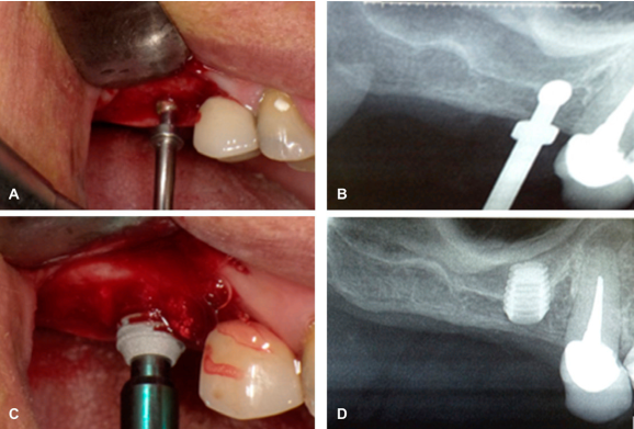 Figura 3 Procedimiento quirúrgico. A. Preparación del lecho quirúrgico. B Radiografía digital de control de la preparación del lecho quirúrgico. C. Colocación del implante corto. D. Radiografía digital final con el implante corto, sin perforar el seno maxilar.