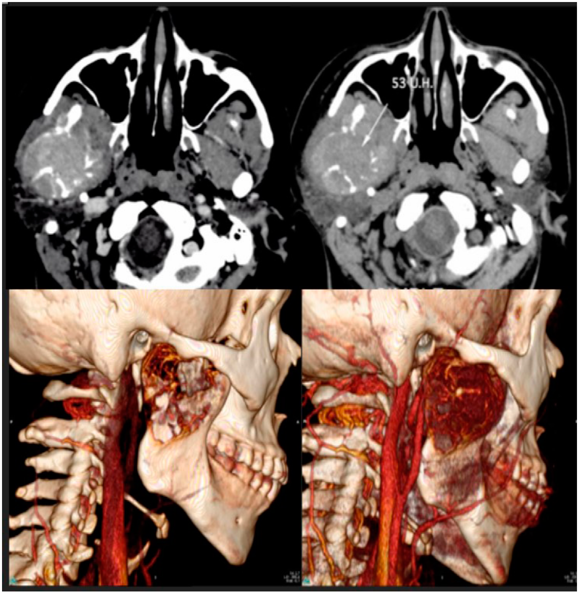 Figura 1 Imágenes tomográficas de Carcinoma Odontogénico de Células Fantasma en el Maxilar. Arriba: corte axial. Abajo: Reconstrucción 3D.