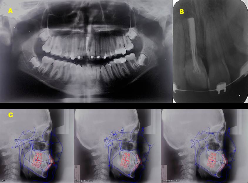 Figure 2 Radiographs. A. Orthopantomography. B. Dentoalveolar of tooth 11, showing external root resorption and root canal treatment. C. Initial cephalometric tracings.