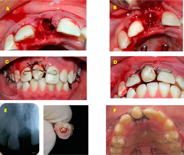 Figure 3 First phase of treatment. A-B. Preparation of the receptor niche. C-D. Fixation of the transplanted tooth in the maxillary central site. E. Post-extraction dentoalveolar radiograph. F. Use of the acrylic plate to promote bite opening.