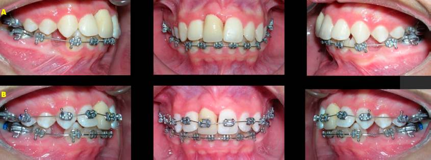 Figure 5 Treatment progress. A. Adjustment and placement of temporary restoration on tooth #11. B. Placement of upper appliances.