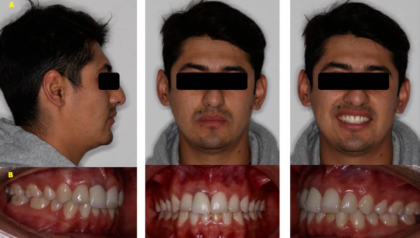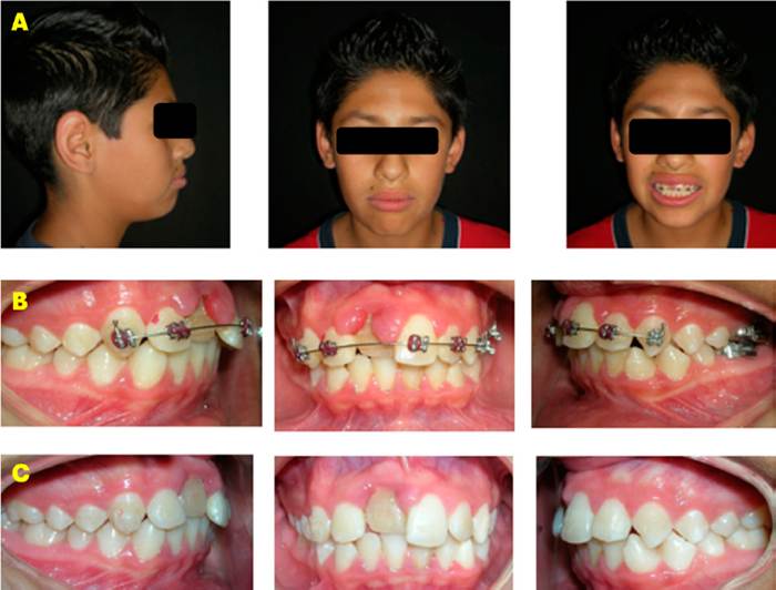 A 14-year-old adolescent patient attended the clinic. His reason for consultation was a complaint about the different heights of his anterior teeth and unsatisfactory results from his previous orthodontic treatment. This was particularly evident when smiling, he also showed gingivitis associated with bacterial plaque and incomplete orthodontic appliances. Extraoral analysis revealed an oval face with disproportionate facial thirds and hyperactive chin muscle; Facially, he showed a disproportionate face, with increased lower facial third, lip incompetence, and excessive exposure (Stm-Incisal Edge=5mm) of the upper incisors during the smile, as well as a smile arch in line with the lower lip, slightly convex and obtuse nasolabial angle, the chin slightly retrusive. It was also observed that the interlabial distance was increased and both lips presented protrusion when evaluated with the vertical to subnasal line (LS-LVs=5mm).
