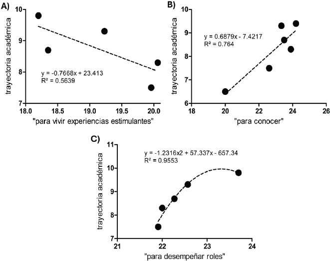 Figura 1 Relación entre las subcategorías de motivación intrínseca y la trayectoria académica. A) Relación negativa entre para vivir experiencias estimulantes y la trayectoria académica. B) Relación positiva entre la motivación para saber y la trayectoria académica. C) Relación positiva entre la motivación para desempeñar roles y la trayectoria académica.