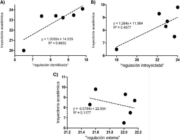 Figura 2 Relaciones entre las subcategorías de motivación extrínseca y la trayectoria académica. A) Relación positiva entre la regulación de identificación y la trayectoria académica con un coeficiente de determinación moderado. B) Relación positiva entre la regulación introyectada y la trayectoria académica. C) Relación negativa entre la regulación externa y la trayectoria académica.