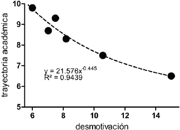 La Figura 3 muestra la relación entre la desmotivación y la trayectoria académica. La línea ajustada representa una función potencial decreciente donde la trayectoria académica disminuye a medida que aumenta la desmotivación (coeficiente de determinación de 0.9439).