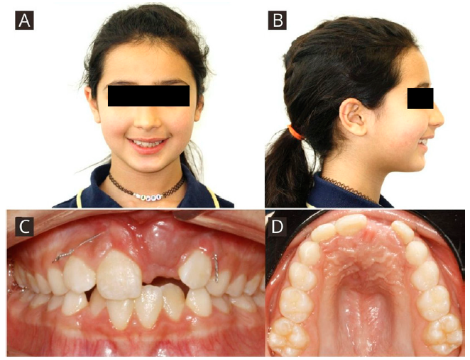 Paciente de género femenino de 9 años de edad, sin antecedentes mórbidos, perfil convexo, clase II esqueletal. En el análisis intraoral se observó dentición mixta primera fase, ausencia del diente 21, neutroclusión molar bilateral, discrepancia óseo-dentoalveolar moderada superior y severa inferior, relación transversal favorable, línea media dentaria superior desviada un milímetro a la izquierda respecto a la línea facial y la línea media dentaria inferior centrada con la línea media facial (Figura 1. A-D). En el análisis con CBCT, realizado con el software Nemotec® se observó el diente 21 en evolución intraósea en una posición alta, horizontal y paralelo al plano oclusal, con formación radicular incompleta, con una distancia de 26.39 milímetros al borde incisal del incisivo central contralateral, y asociado a este se encontró un diente supernumerario en posición alta en relación con el piso de fosas nasales, de forma coronaria cónica ubicado hacia palatino (Figura 2. A-B). En la primera fase de tratamiento, se inició por la desinclusión del diente supernumerario y luego se abordó el diente 21 mediante una exposición quirúrgica cerrada realizada por un cirujano maxilofacial, en el mismo acto quirúrgico se instaló un botón vestibular y uno palatino de refuerzo con ligadura de acero inoxidable de 0.9 Ferderhard (FH) para la tracción. Se realizó instalación de biteblock céntrico, el cual consistió en un dispositivo interoclusal cementado confeccionado en articulador digital para mantener la funcionalidad masticatoria y evitar contactos prematuros, y que tiene un botón central para otorgar rigidez que fue activado ¼ de vuelta a diario por 12 días. Desde este botón se confeccionó un brazo de tracción en alambre de acero inoxidable de calibre 0.8 FH, realizando la activación de la tracción 15 días posterior a la cirugía cada cuatro semanas, dejando la encía del reborde marginal levemente isquémica con una fuerza de aproximadamente 50 gramos (Medidor de tensión VTSYIQI model ATG-500-2 ®) (Figura 3. A-B).