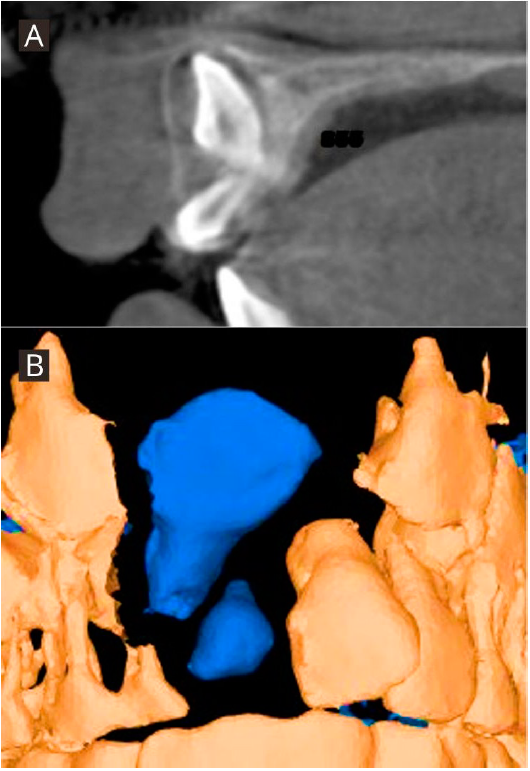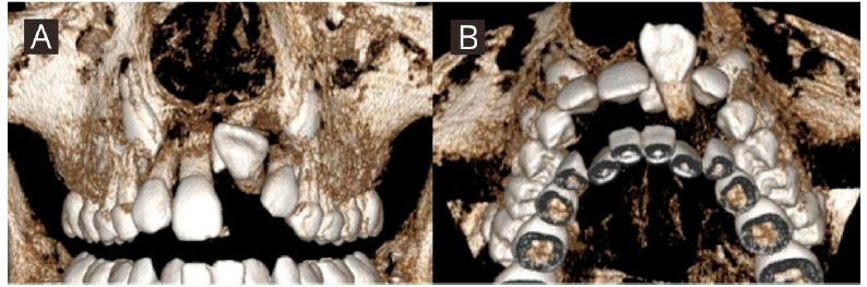 Figura 2 Representación tridimensional de posición inicial de diente 21 evaluado en CBCT. A. Vista frontal. B. Vista axial.