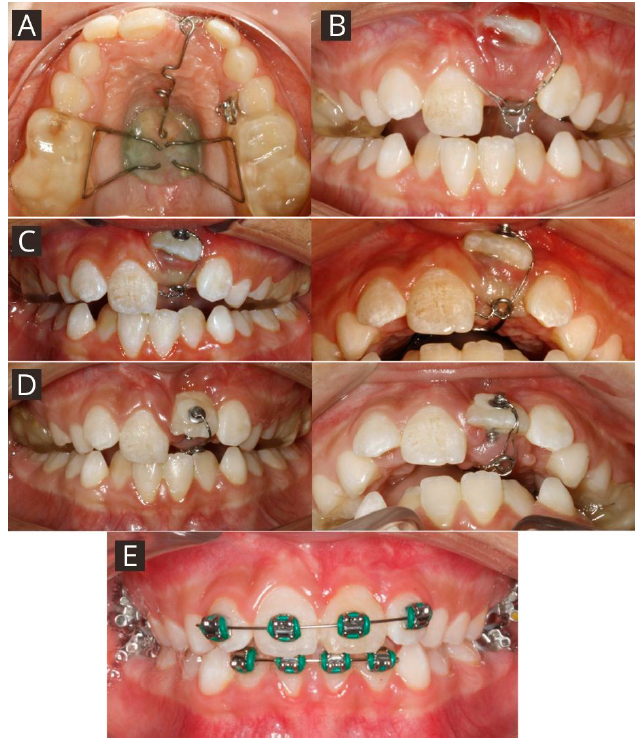 Figura 3 Fotografías durante el tratamiento. A. Instalación Bite block céntrico con brazo de tracción. B. Activación de brazo de tracción. C. Control a las 4 semanas de tracción. D. Control a las 8 semanas de tracción. E. Instalación de aparatología fija 2x4 para alineación del grupo incisivo superior.