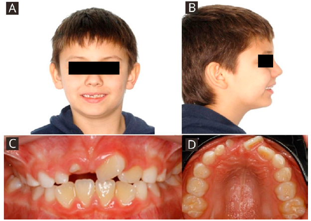 Paciente de género masculino de 8 años de edad, sin antecedentes mórbidos. Perfil convexo, clase II esqueletal. En el análisis intraoral se observó dentición mixta primera fase, diente parcialmente erupcionado en zona de diente 11, diente 21 mesiorotado, distoclusión molar bilateral, discrepancia óseo-dentoalveolar severa superior y moderada inferior, relación transversal desfavorable, líneas medias dentarias centradas (Figura 4. A-D). En el análisis con CBCT, realizado con el software Nemotec ® se observó el diente 11 en evolución intraósea en una posición alta, perpendicular al plano oclusal con formación radicular incompleta, ubicado hacia vestibular, con una distancia de 19.57 milímetros al borde incisal del incisivo central contralateral, y la presencia de un diente supernumerario parcialmente erupcionado, de forma coronaria cónica en zona del diente 11 (Figura 5. A-B).