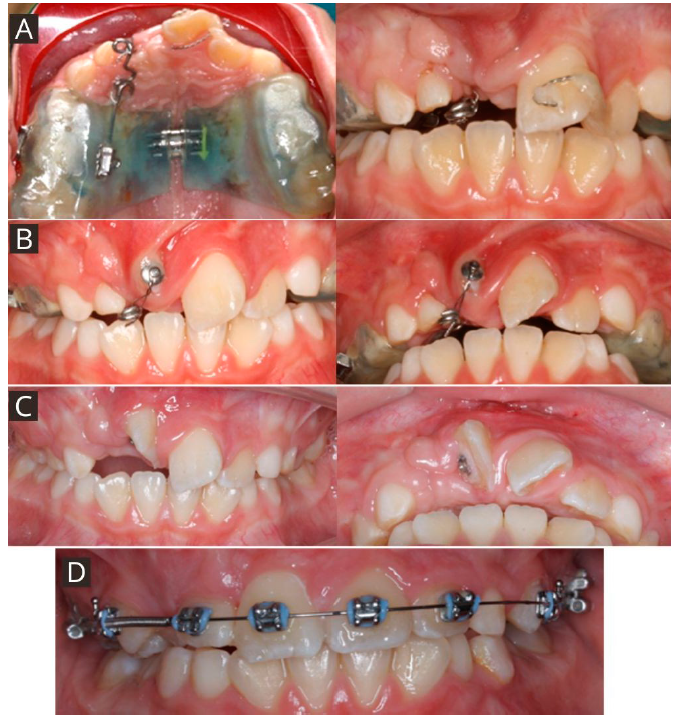 Figura 6 Fotografías clínicas de seguimiento. A. Instalación de disyuntor McNamara con extensión palatina acrílica, brazo de tracción palatino con alambre 0.9 FH y tornillo central simple. B. Control a las 20 semanas de tracción. C. Control a las 28 semanas de tracción. D. Instalación de aparatología fija para la alineación y nivelación del grupo incisivo superior.