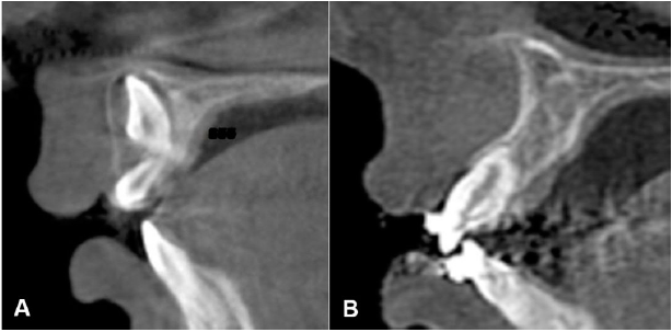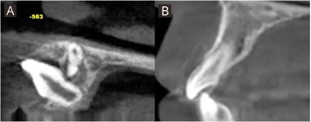 Figura 7 Imágenes tomográficas. A. Evaluación inicial de diente 21 en CBCT, corte sagital. B. Evaluación final de diente 21 en CBCT, corte sagital.