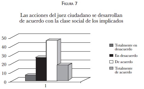 Esta figura plantea que un poco más de la mitad de los entrevistados considera que la clase social a la que pertenece el juez ciudadano influye en sus decisiones. Sobre este aspecto habría que profundizar a la hora de analizar esta actitud en función de la clase social del imputado.