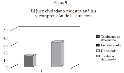 Esta gráfica muestra que la percepción de más de la mitad de los encuestados considera que los jueces ciudadanos no analizan, o no pueden analizar y/o comprender, el contexto o situación total que implica el juicio.