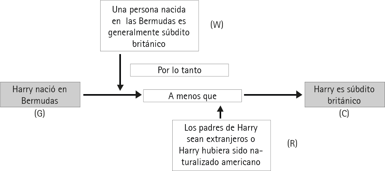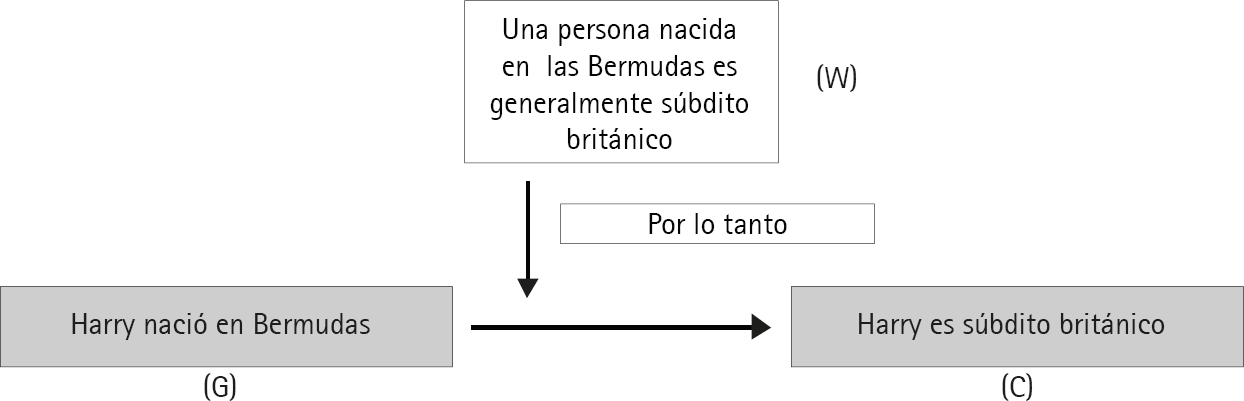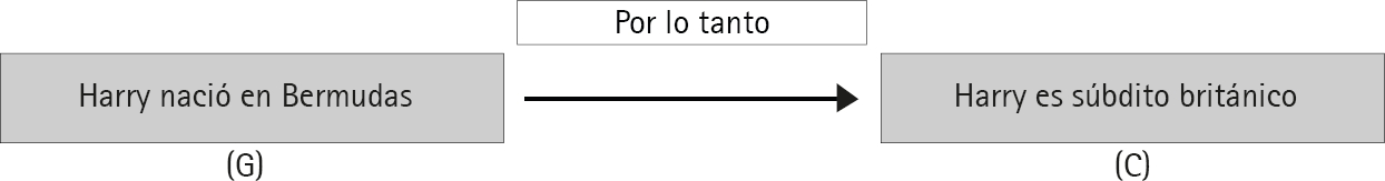 Si iniciamos afirmando una pretensión (o ‘claim’) como ‘Harry es súbdito británico’, y si alguien duda de ella o la cuestiona afirmando por ejemplo ‘¿por qué afirmas que «Harry es súbdito británico»?’, entonces, nuestra siguiente afirmación, por ejemplo, ‘Porque Harry nació en Bermudas’, serán los datos (o ‘grounds’) con los que respaldamos aquella primera afirmación, de modo que esta se transforma para quedar finalmente así: “Harry es súbdito británico porque Harry nació en Bermuda”62. Y el esquema de este argumento se representa así (cuadro 1):