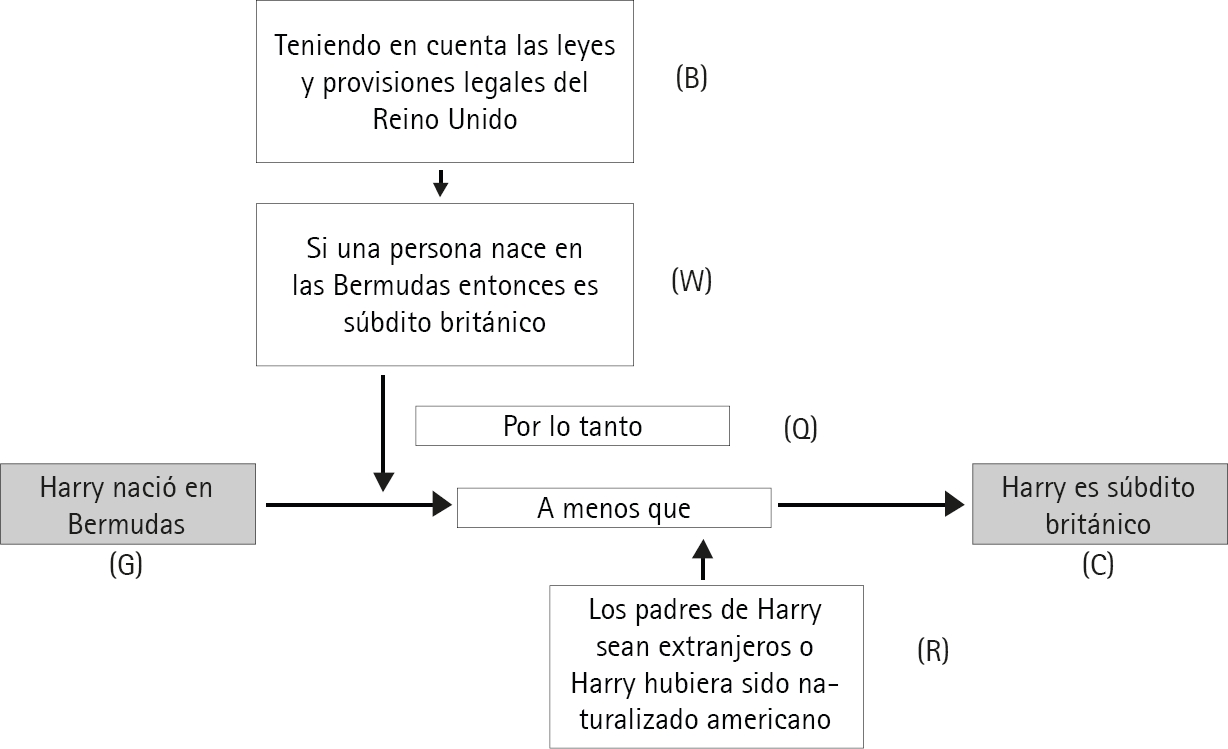 Si, a pesar de haber demostrado que los padres de Harry no son extranjeros y que Harry no ha sido naturalizado, nuestro interlocutor cuestionara sobre la garantía aducida afirmando por ejemplo ‘¿Por qué estás seguro de que “una persona nacida en las Bermudas es generalmente un súbito británico?’, entonces debemos mostrar que, a través de un respaldo (‘backing’), nuestra garantía es válida, relevante y con un suficiente peso para convencer a nuestro insatisfecho oyente; así, afirmaríamos lo siguiente: ‘Teniendo en cuenta las leyes y provisiones legales del Reino Unido, si una persona nace en Bermudas, entonces es súbdito británico, a menos que sus padres fueran extranjeros o que dicha persona hubiera sido naturalizada americana. Y dado que Harry nació en Bermudas, y que sus padres no son extranjeros, ni él se naturalizó americano, entonces, Harry es súbdito británico’. El esquema final de toda esta argumentación sería el siguiente (cuadro 4):