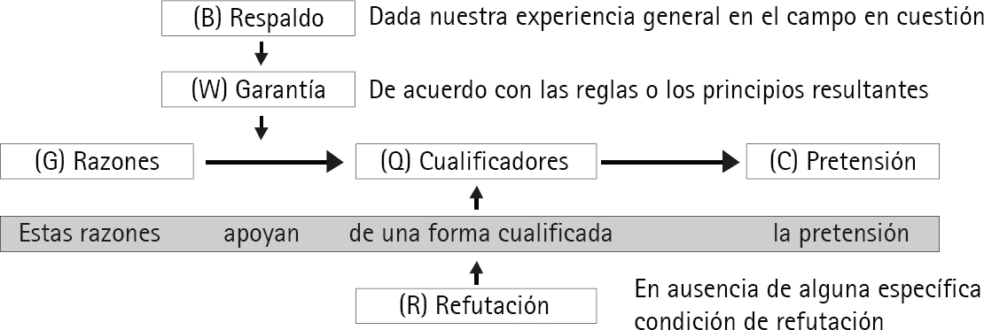 En este marco, la representación de la estructura de los argumentos ocupa un área de creciente importancia para la Teoría de la Argumentación (TA)7. Así, aunque esta disciplina se ha desarrollado en una amplia gama de temas, a través de conceptos como «esquema», «modelo» o «diagrama» se han desarrollado específicas líneas de investigación todas ellas relevantes, puesto que se elaboran con el objetivo de mejorar la construcción, la representación, el análisis y la evaluación de la argumentación8. La contribución de Stephen E. Toulmin es, en este contexto, referencial, pues el denominado «modelo argumentativo de Toulmin» ha sido empleado para analizar, representar y evaluar los componentes estructurales de un argumento9.