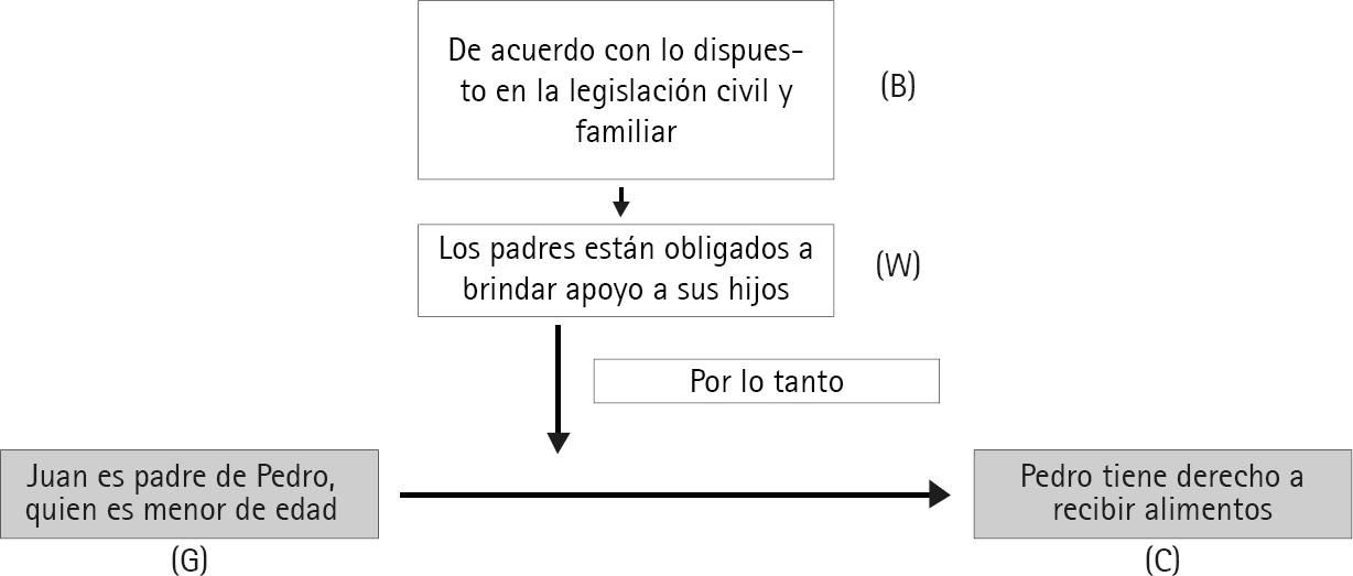 Empero, nuestro ejemplo está en relación con una acción de pensión alimenticia. Entonces, imaginemos que alguien afirma que ‘Pedro tiene derecho a recibir alimentos’ (pretensión), y uno de los hechos que aduce para este propósito es que ‘Juan es padre del menor de edad de nombre Pedro’ (razones); del mismo modo, se firma que existe un principio general del derecho (garantía) según el cual ‘los padres están obligados a brindar apoyo a sus hijos’, entonces se sostiene finalmente que ‘de acuerdo con lo dispuesto en la legislación civil y familiar, Juan tiene derecho a recibir alimentos’ (respaldo). Aplicado el modelo de Toulmin en este caso, su esquematización quedaría así (cuadro 6)76: