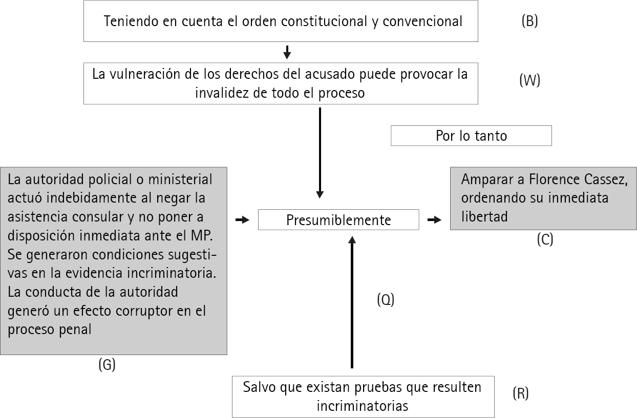 Como se sabe, este es uno de los casos más relevantes que en los últimos tiempos ha resuelto la Suprema Corte de Justicia de la Nación (SCJN). En este caso, la Suprema Corte decidió conceder la libertad a la ciudadana francesa Florence Cassez dado que esencialmente existió una violación al debido proceso. De acuerdo con la Primera Sala del Máximo Tribunal mexicano, la vulneración de los derechos fundamentales del acusado en el proceso penal puede provocar, en determinados supuestos, la invalidez de todo el proceso, así como de sus resultados, lo cual imposibilitaba al juez para pronunciarse sobre la responsabilidad penal de una persona. Específicamente, para la Primera Sala, consideró que el ‘efecto corruptor’ del proceso penal se actualiza cuando, en un caso concreto, concurran las siguientes circunstancias: a) que la autoridad policial o ministerial realicen alguna conducta fuera de todo cauce constitucional y legal; b) que la conducta de la autoridad haya provocado condiciones sugestivas en la evidencia incriminatoria que conlleven la falta de fiabilidad de todo el material probatorio; y c) que la conducta de la autoridad impacte en los derechos del acusado, de tal forma que se afecte de forma total el derecho de defensa y lo deje en estado de indefensión. Entonces, la Suprema Corte, al advertir la actualización de estos supuestos, decretó la libertad de la señora Cassez, porque además no existieron otras pruebas que resultaran incriminatorias. Pues bien, este caso puede ser esquematizado de la siguiente forma (cuadro 7):