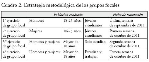Así, se planteó la integración de cuatro grupos focales. El número de participantes por grupo fue de seis a 12, de acuerdo con la respuesta a la convocatoria. Se propusieron: un grupo formado por hombres jóvenes que solo estudian -con edad comprendida entre los 18 y 25 años-; un grupo de mujeres con la misma característica; un grupo mixto de jóvenes mayores de 18 años que solo estudian, y un grupo mixto de jóvenes mayores de 18 años que estudian y trabajan (cuadro 2). La realización de los cuatro grupos focales se llevó a cabo en la sala específica para este tipo de ejercicios que posee la üam, Unidad Iztapalapa.