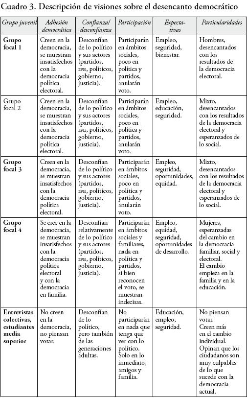 La conclusión general del análisis de los cuatro grupos focales y de las entrevistas colectivas es la poca adhesión democrática que existe entre los jóvenes. Si bien se reconocen como demócratas -sobre todo desde esferas cotidianas e inmediatas, entre las que se encuentran la relación con la familia y los amigos-,reconocen poco la existencia de la democracia en México y muy pocos confían en la democracia mexicana como mecanismo de solución a las problemáticas cotidianas.