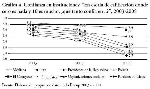 Con respecto a la confianza en las instituciones, es necesario apuntar la baja calificación dada por los mexicanos a las instituciones políticas, donde el IFE es el organismo del ámbito político mejor evaluado. Al IFE le sigue el presidente de la República y muy por debajo de ellos se encuentran los partidos políticos, los sindicatos y la policía. En el medio social, los médicos fueron los mejor calificados, seguidos por las organizaciones sociales (gráfica 4).