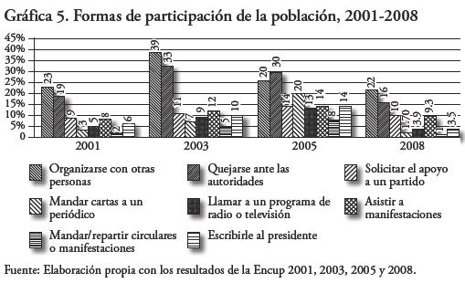 Por último, con respecto a las formas de participación de la población en general en la esfera de la política, resalta la baja participación Destaca la caída en algunas acciones, como enviar denuncias y peticiones mediante la televisión, radio y prensa escrita, solicitar apoyo a un partido político, así como escribir circulares y manifiestos (gráfica 5).