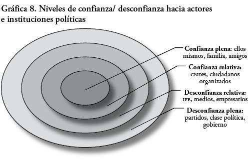 En la gráfica 8 se señalan, ilustradas por áreas, las intervenciones más recurrentes de los jóvenes con respecto a la dicotomía confianza/ desconfianza en las instituciones políticas y sociales que ellos asocian con la democracia.