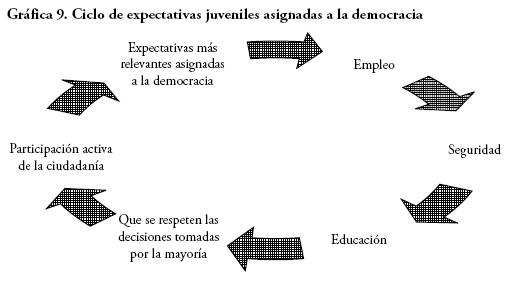 En la gráfica 9 resumo las expectativas juveniles vertidas durante el estudio. El sentido de sus participaciones siempre destacó el aspecto económico representado en la obtención de un empleo. No obstante, también resaltan las demandas de seguridad, educación y respeto por las decisiones tomadas por la mayoría. Se exigen mayor participación en la toma de decisiones, y aspiran a representar una ciudadanía más activa... en beneficio de la generación siguiente.