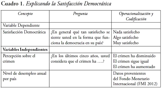 La variable dependiente es la satisfacción democrática, que puede tomar tres valores o categorías: nada satisfecho, algo satisfecho y muy satisfecho. El Cuadro 1 muestra la operacionalización y la codificación de las variables. La variable explicativa clave es la percepción sobre el crimen. Como variable control el análisis utiliza el nivel de desempleo por país en América Latina.