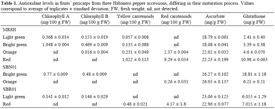 Habanero peppers are mainly appreciated for their extreme hotness or pungency, and most plant inventories focus on variations of capsaicin content among different varieties [5]. However, in general, peppers are considered an alternative source for vitamin C and other antioxidants, and thus these compounds may constitute an added value for their cultivation and human consumption. Antioxidant and other nutrimental properties can widely vary depending on genotype, developmental stage and plant growing conditions. Hence in the present work, we have analyzed the content of carotenoids, chlorophylls, ascorbate and glutathione in the pericarp and placental tissues from three accessions of C. chinense differing in the color of the fruits throughout the maturation process. These accessions were taken from a collection cultivated in the state of Yucatan, which possess the largest genetic diversity in México. Our results provide useful information to choose the best cultivar for human consumption given its nutraceutical value, based on antioxidant levels.