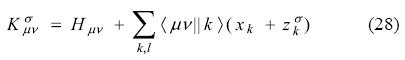 Hμv represents an element in the mono-electronic matrix. It includes kinetic energy, nuclear attraction integrals and any other external potential [18]. The Kohn-Sham matrix elements are obtained by differentiation of Eq. (11) with respect to the density matrix elements:
