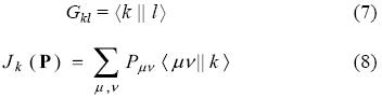 where the fitting coefficients are collected in the vector x, here we have introduced the Coulomb matrix G and the Coulomb vector J, whose elements are defined by [50]: