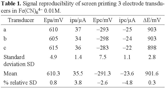 In order to evaluate the reproducibility of the transducer electrochemical signals, we obtained voltammograms of three transducers of the same batch. The devices show good reproducibility respect to the potential position and current peak (Table 1).