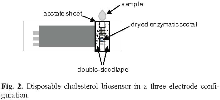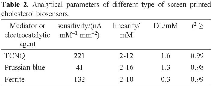 Actually there are a broad variety of electrochemical biosensors for quantification of cholesterol [7]. However, only few of these biosensors embrace the concentration range required for analysis of blood serum (3.5-6.5 mM). Moreover, in most of the reports, construction methodology is not compatible with mass production processes to achieve reproducibility, low cost and miniaturization of the devices. In this sense, the reported developments are not viable for the analysis of cholesterol by the patient at home or by the doctor in his office in order to take timely action that will lead to improve health. Encouraged by these limitations, recently some studies have reported the development of planar electrochemical cholesterol biosensors produced by screen printing which are suitable for decentralized analysis [8-10].