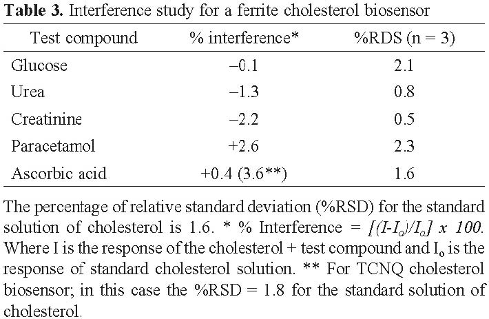 Interference is always an important issue for the development of an electrochemical biosensor. The electrodes based on the use of cholesterol oxidase and measuring the release of hydrogen peroxide may be affected by the presence of interfering such as ascorbic acid, glucose, creatinine, etc., which are usually present in biological components such as blood samples or body fluids, therefore, the interference of these compounds has been studied for the ferrite cholesterol biosensor. These species were added into 2.5 mM cholesterol standard solution in their normal physiological concentration (glucose 5.4 mM, urea 3.3 mM, creatinine 1.7 mM, ascorbic acid 1.1 mM and paracetamol 1.3 mM). It has been found that the response of the biosensor for the electroactive species tested is negligible respect to the cholesterol standard measurement. This result is comparable to the TCNQ cholesterol biosensor for ascorbic acid (Table 3).