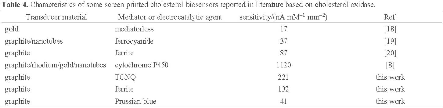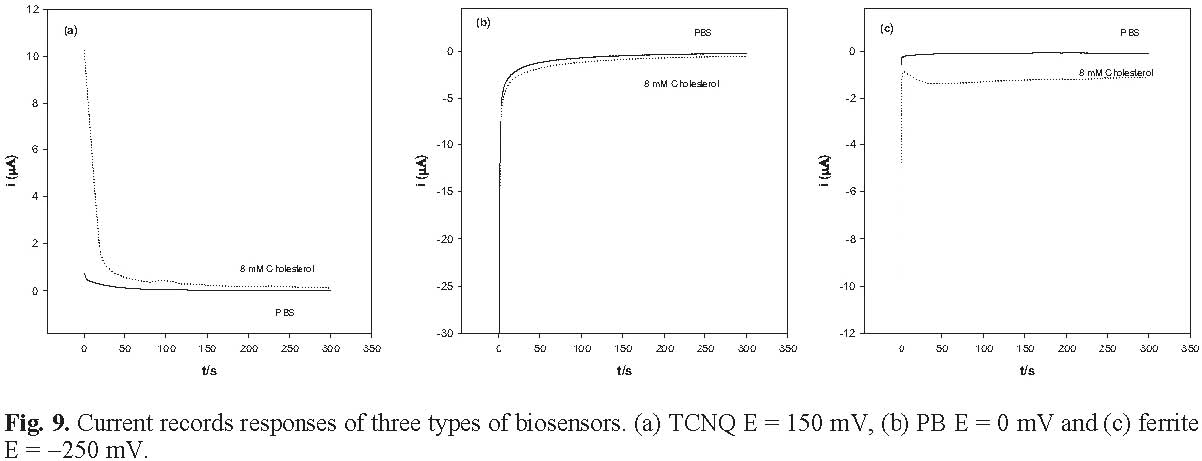 Considering the three developed transducers, three different biosensensors were evaluated by means of chronoamperometric records (Fig. 9). In order to obtain the analytical parameters of the biosensors, calibration curves were performed for cholesterol from the chronoamperometric records at 100 sec. The results shows good proportionality of the current with respect to the concentration of cholesterol, having a linear behavior for concentrations in the range 2-16 mM which include the blood normal levels of the lipid (3.5-6.5 mM). The detection limit calculated from the calibration curve according to the IUPAC recommendation is 1.56, 1.29 and 0.29 mM for TCNQ, PB and ferrite respectively (Table 2).