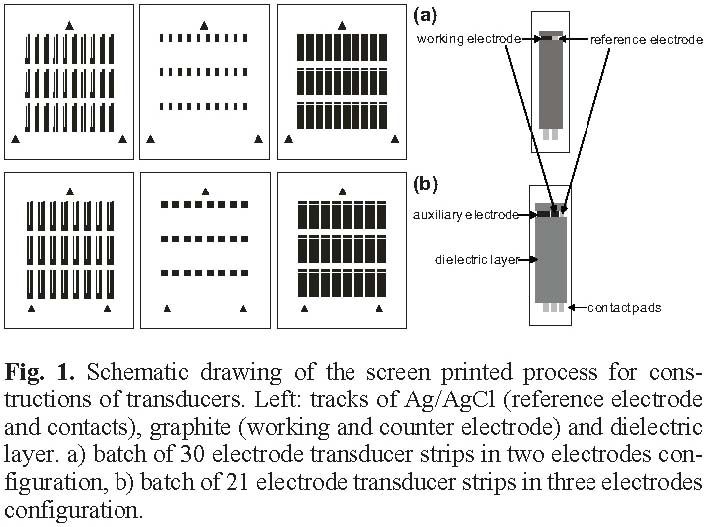 Construction of transducers. Transducers were fabricated on a planar configuration of two and three electrodes. Both transducers were manufactured by screen printing with silkscreen manual equipment with screens of 90 lines by square inch and a standard polyurethane squeeze (Fig. 1). Commercial screen printing Ag/AgCl paste Electrodag 7019 (Acheson) was used to print the reference electrode and graphite paste Electrodag PF-407C (Acheson) was used for both working and counter electrodes. Previous to the printing process of the working electrodes, the graphite paste was mixed with 5% of Prussian blue or 5% TCNQ-graphite or 40% of ferrite. As encapsulant, it was used a photocurable dielectric paste 451SS (Acheson). Curing cycles were carried out at 40 ºC for at least 30 min for thermosetting resins. The curing of photocurable encapsulant was completed for 1 hour under direct sunlight (Fig. 1).