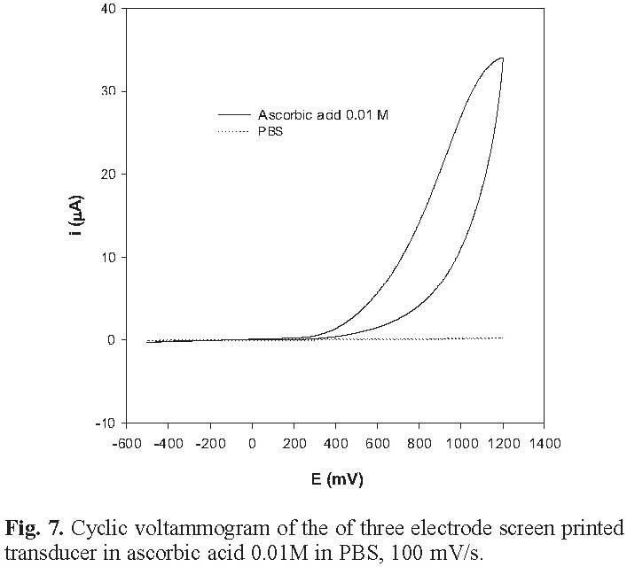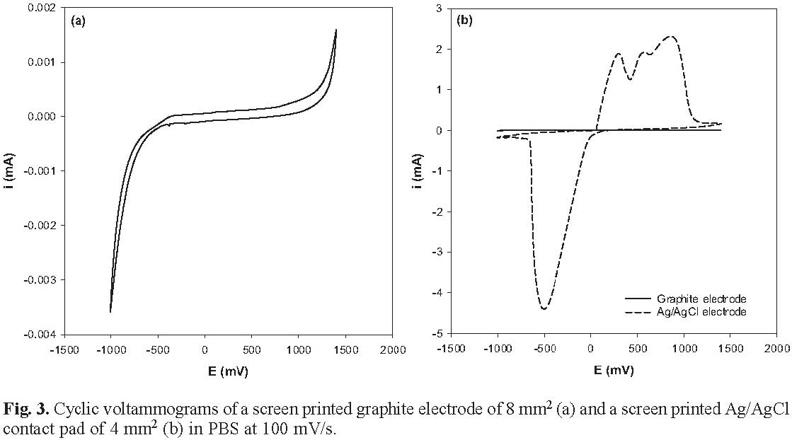 The Ag/AgCl pad shows three anodic signals. The first one (280 mV) is attributable to the oxidation of Ag° to AgCl because PBS contains 0.01 M of chloride ions concentration. The second one shows the oxidation of Ag° to Ag+ (570 mV), and the third one (820 mV) probably is due to oxidation of some component of the screen printing paste, as vinyl monomers, stabilizers or additives.