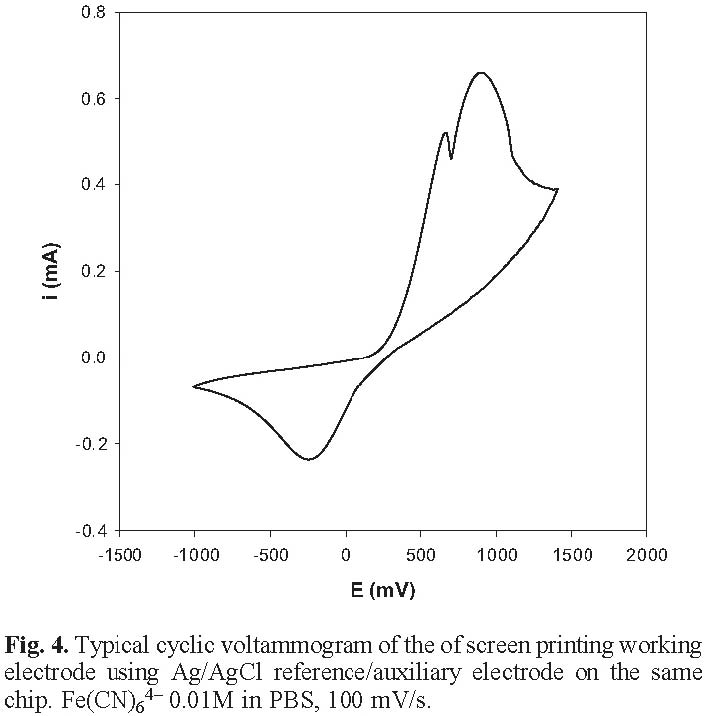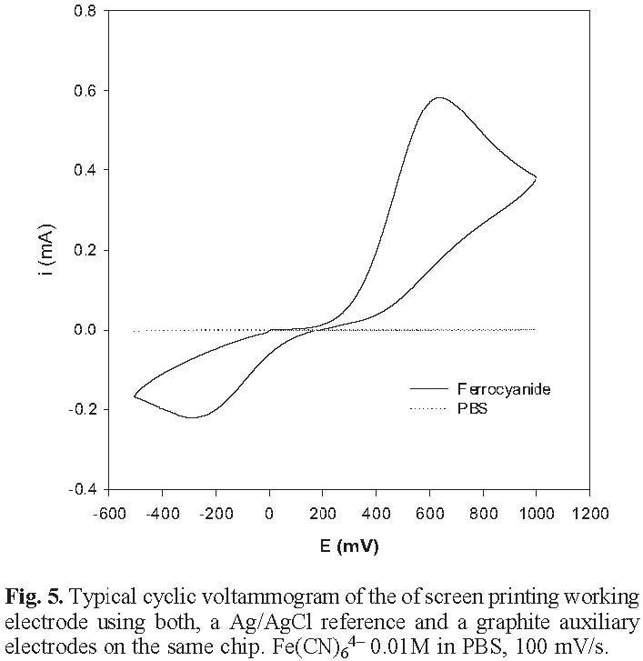 In order to evaluate the electrochemical behavior of the two electrode transducers, cyclic voltammograms in ferrocynide were obtained using the reference electrode on the same chip (Fig. 4). The potential of this reference electrode is of 72 ± 2 mV vs SCE. The result shows two anodic and one cathodic peaks. The signals placed in 610 mV and −290 mV are attributed to the average potential of oxidation/reduction of ferrocynide/ferricyanide system. The second anodic peak located at 880 mV is attributed to the oxidation of a component of the reference paste Ag/AgCl electrode. We suppose this compound migrates to the working electrode previous reduction on its surface.