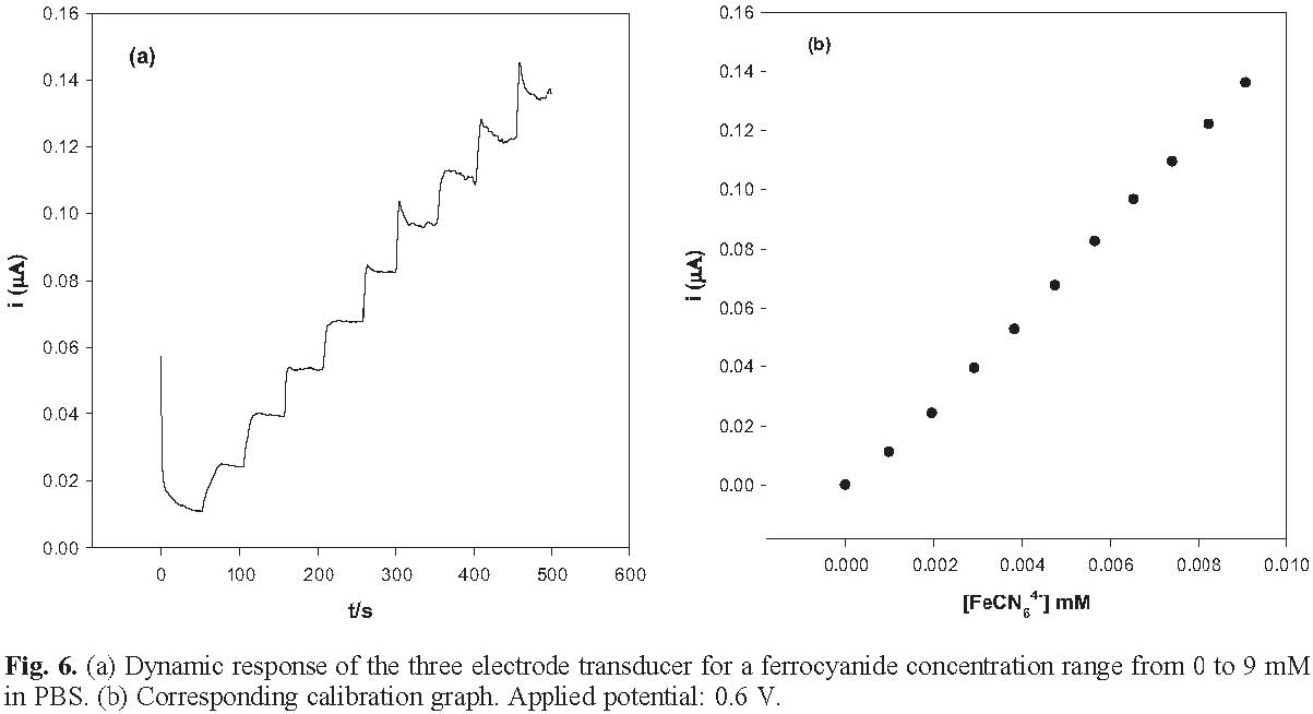 According to the results we can recognize how the electronic transference onto the transducer is not good because the broad difference between the oxidation and reduction peaks and the not ideal relation of current among anodic and cathodic peaks (Table 1). Nevertheless the transducers developed are useful because the small currents involved with cholesterol biosensors which are usually of nanoampers [13]. The three electrode transducer developed displayed a good behavior in the cronoamperometric studies obtained by means of successive additions of ferrocyanide under magnetic stirred regime (Fig. 6). Respective calibration curve shows excellent linearity between 0.9 and 9 mM of Fe(CN)6−4 with a regression coefficient of 0.99.