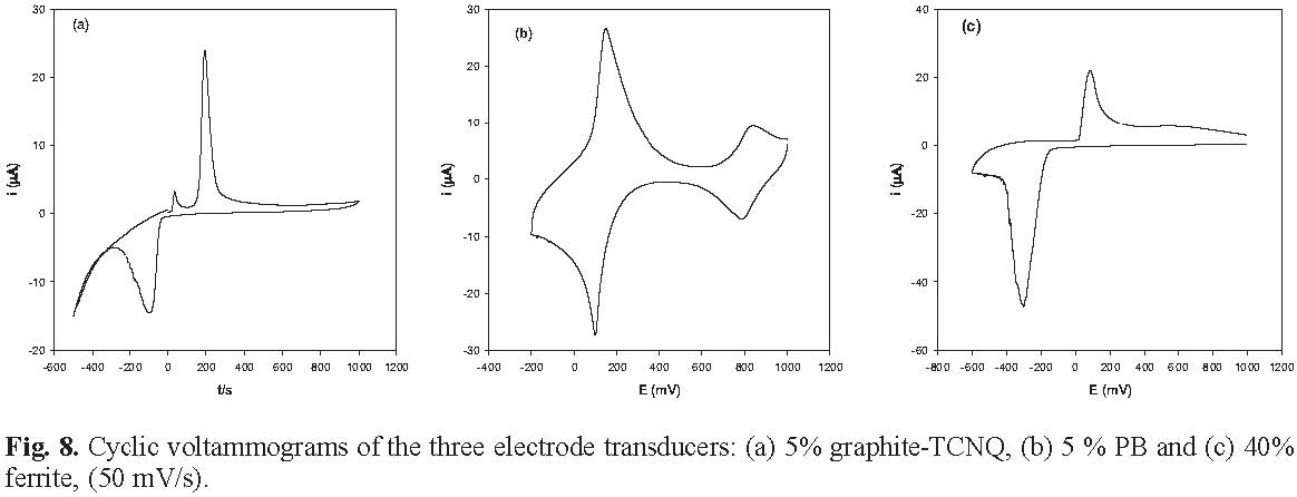 The voltammograms of the three types of transducers are showed in Fig. 8. According to the results the selected working potentials were 150, 0 and −250 mV for TCNQ, PB and ferrite respectively.