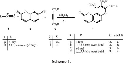 The reactions of 1-azadienes with various chiral dienophiles, leads to substituted pyridines [10], and substituted 4H-chromenes are a new class of anti-cancer compounds [11]. 2-Amino-4H-chromenes have been of interest because of their biological activity [12] and some methods have been reported for their synthesis [13-20]. As part of our current studies [21-26] on the development of new routes to heterocyclic systems, we now report an efficient synthetic route to 2-amino-4H-chromenes (4) using alkyl isocyanides (1), 7-hydroxycoumarin (2) and alkyl acetylenedicarboxylate (3) (Scheme 1). When the reaction was performed with cyclohexyl isocyanide, 1-azabuta-1,3-dienes (5) were obtained (Scheme 2).