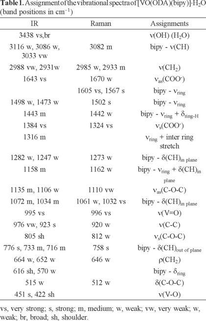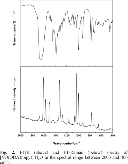 - The 2.2'-bipyridine bands were assigned on the basis of previous studies of the free molecule [18,19]. In general, most of the characteristic ring bands in the 1700-1300 cm-1 region are slightly displaced to higher frequencies upon coordination and slight displacements and/or intensity changes were also observed in other spectral regions. A similar behavior was also observed in the case of the o-phenanthroline bands in [VO(ODA)(phen)]⋅1.5H2O [20], and it can be considered as characteristic of these type of ligands [25]. Interestingly, some of the bipy-ring motions present very high Raman intensity and have not IR counterparts, whereas the inter-ring stretching vibration could not be identified in the Raman spectrum.