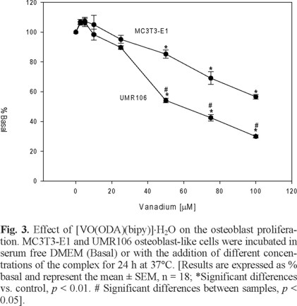Figure 3 shows the action of the oxovanadium(IV) complex [VO(ODA)(bipy)]⋅H2O on osteoblast proliferation. The effects on two bone related cell lines, one of normal phenotype (MC3T3-E1) and the other tumoral, derived from a rat osteosarcoma (UMR106)), were evaluated by the crystal violet bioassay. As can be seen, the complex inhibited more strongly the proliferation of the osteosarcoma cells than the non-transformed osteoblasts in the whole range of concentration (*p < 0.01). Besides, it can be seen from this figure that in the high concentration range (50 - 100 µM), the complex was markedly more deleterious for the UMR106 cells than for the MC3T3-E1 osteoblasts (#p < 0.05). At the highest tested concentration (100 µM), the MC3T3-E1 cells showed a survival of 56% while for UMR106 it was of 30% (*p < 0.01), in comparison with the control condition.