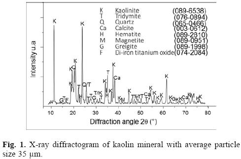 X-ray diffraction analysis revealed the nature of the crystalline phases present in the mineral as shown in Fig. 1. The study sample is mainly constituted by the kaolinite mineral with minor contributions of silica were also detected as quartz and tridymite. Iron is considered to be an impurity and is present as magnetite (Fe3O4), hematite (Fe2O3), titanium oxide-ferrous (Fe2TiO4), and greigite (Fe3O4).