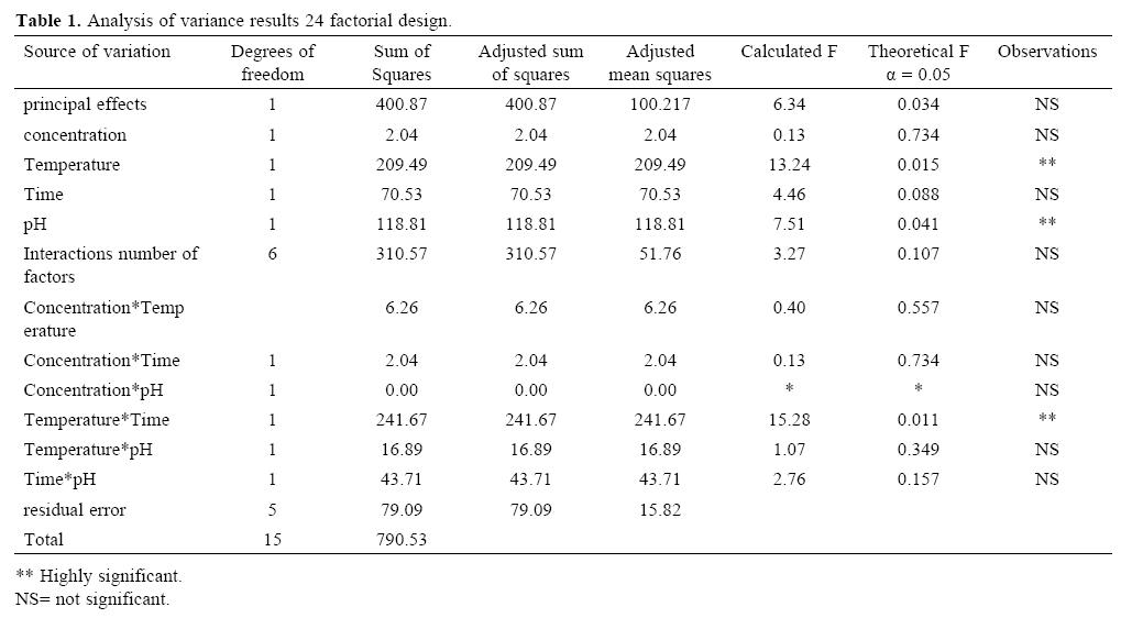 Fig. 2 and 3 show the graphs of principal effects and normal effects, respectively. Concentration does not have a significant effect in the range from 0.35 M to 0.50 M; however, the effects of temperature, pH and the combined effects of temperature and time are significant.