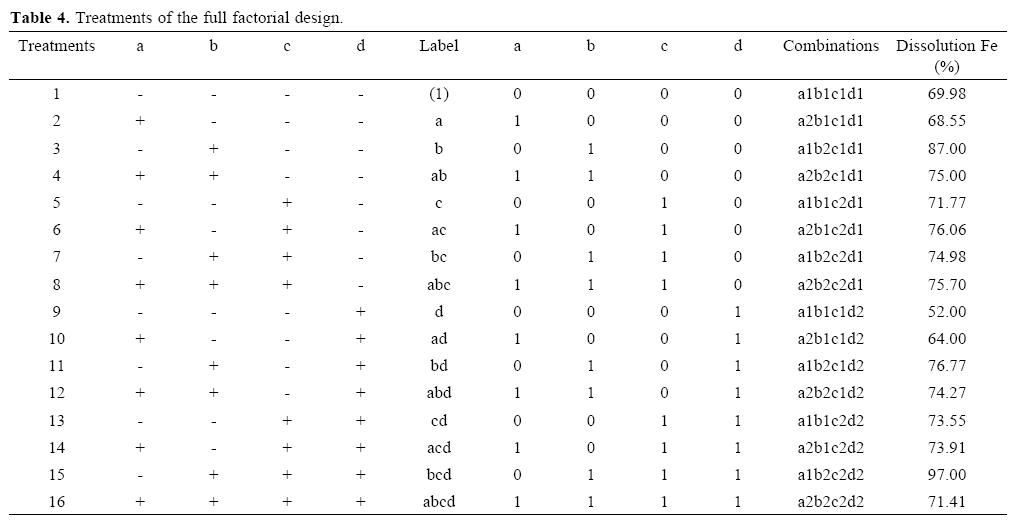 Leaching experiments were carried out according to a 24 factorial design with two replicates. The independent variables included the concentration of oxalic acid (0.35 and 0.50 M), temperature (75 °C and 100 °C), extraction time (2 and 4 h), and pH (1.5 and 2.5). The dependent variable was the percent age of dissolved iron. The factors and the levels investigated are shown in Table 3 and the treatments of the factorial experiment are shown in Table 4.