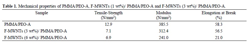 The mechanical properties of PMMA/PEO-A, PMMA/PEO-B and F-MWNTs filled PMMA/PEO-A and PMMA/PEO-B blend are listed in tables 1 and 2. Table 1 show that the tensile strength, modulus and elongation at break of pure PMMA/ PEO-A blend was 12.9 N/mm2, 385.50 N/mm2 and 58.3 %, respectively. Table 1 also shows that the mechanical properties of the PMMA/PEO-A were decreased when F-MWNTs were added to the blend system. The tensile strength and moduli of F-MWNTs filled PMMA/PEO-A blend was decreased inthe range of 5-6 N/mm2 and 73-144 N/mm2, respectively. The elongation at break (show the flexibility) was also decreased in the case of F-MWNTs filled PMMA/PEO-A (4-37 %) than pure PMMA/PEO-A.